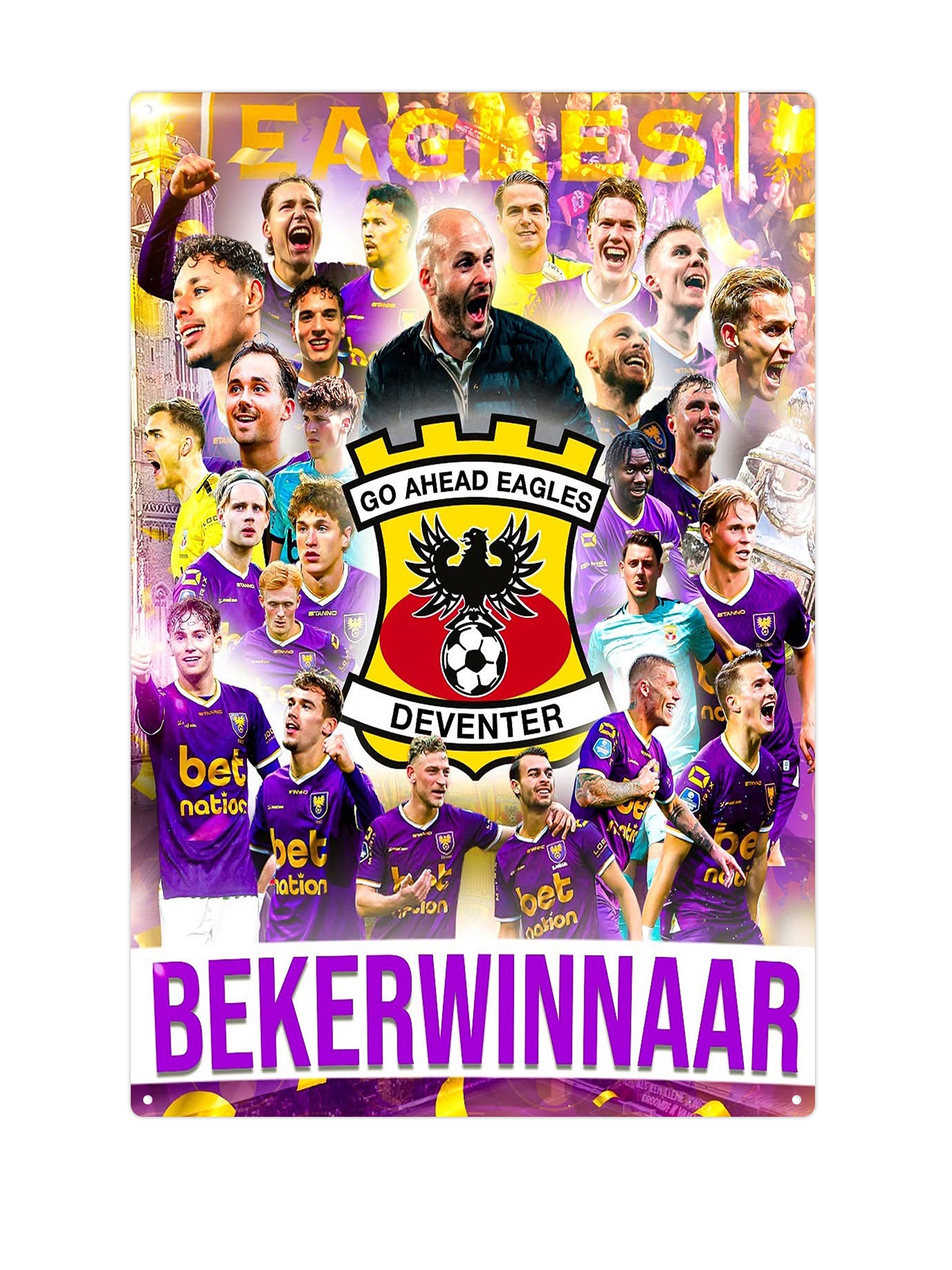 Show your pride for the Go Ahead Eagles with this unique metal wall sign . Measuring 30x20cm, this wall sign is perfect to hang in your living room, bedroom or mancave. The design celebrates the glorious victory of the 2025 KNVB Cup , in which the Go Ahead Eagles emerged as the winner. This wall sign is not only a tribute to your favourite team, but also a beautiful decorative piece that will stand out anywhere in your home.