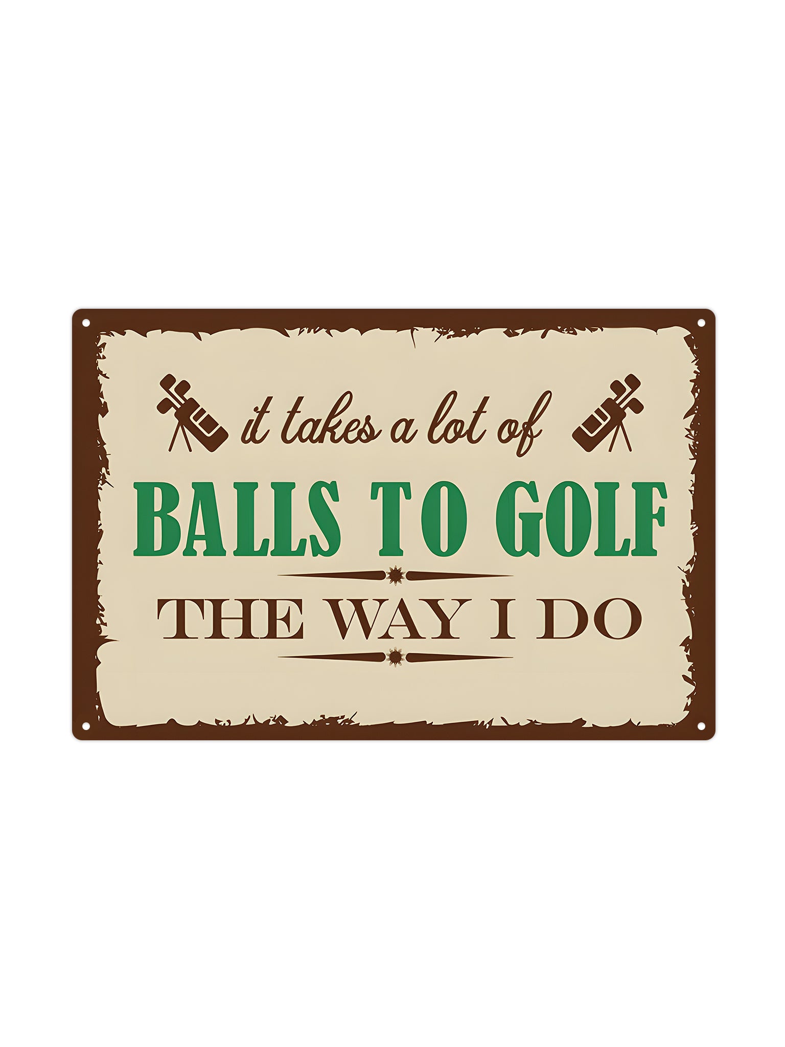 Add a touch of humor and personality to your interior with our unique Metal Wall Sign 30x20 cm. This vintage style wall sign with the humorous text "It takes a lot of balls to golf the way I do" is perfect for any golf enthusiast or as a gift for that friend or family member with a passion for golf.