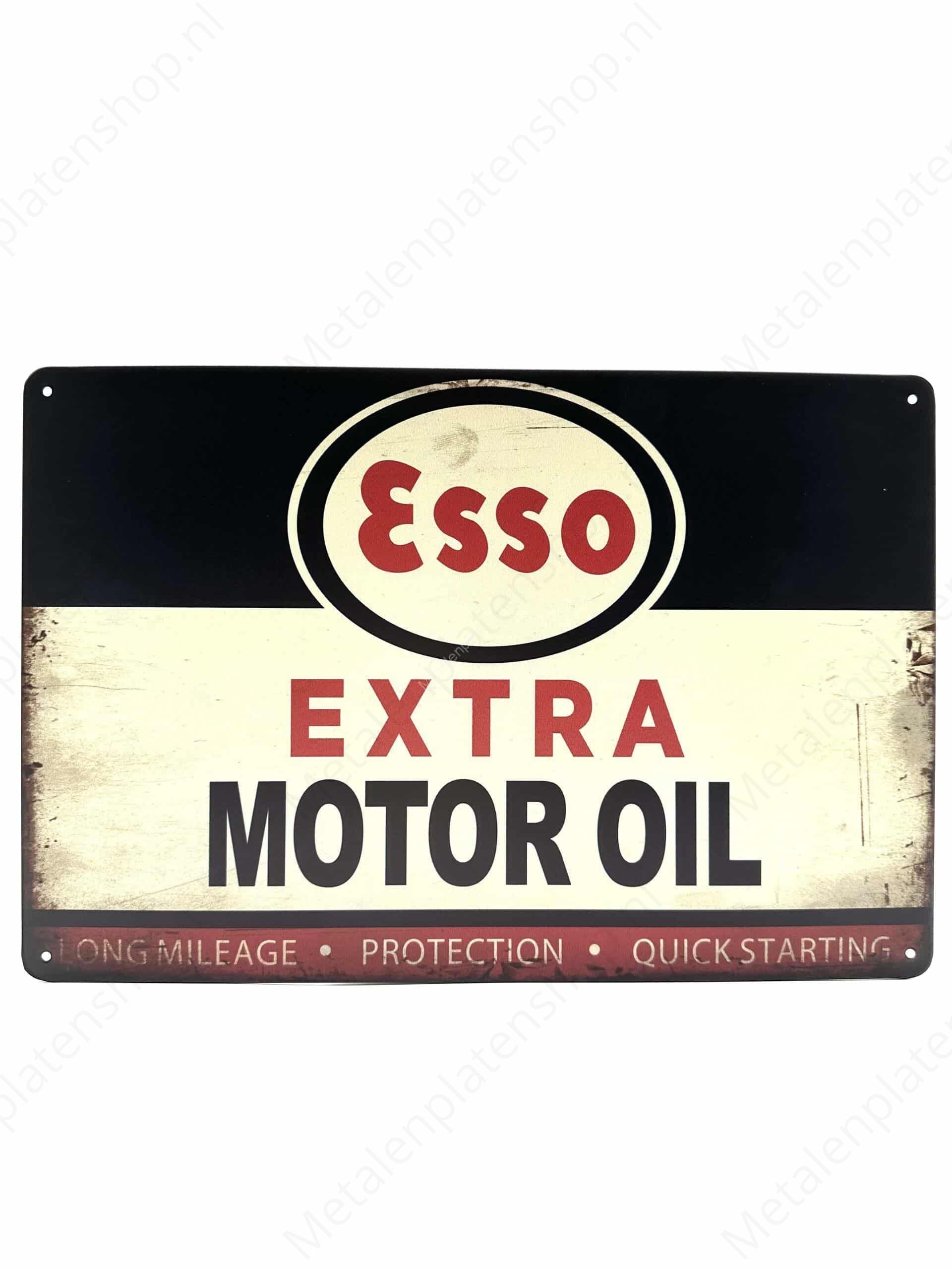 The Metal Sign "ESSO - Extra Motor Oil - Long Mileage - Protection - Quick Starting" is a nostalgic and decorative item, designed for enthusiasts of vintage automobilia and collectors of classic gasoline and oil-related memorabilia. This sign pays tribute to the rich history of Esso, one of the most recognizable names in the oil industry, and their dedication to providing high-quality products for the automotive market.