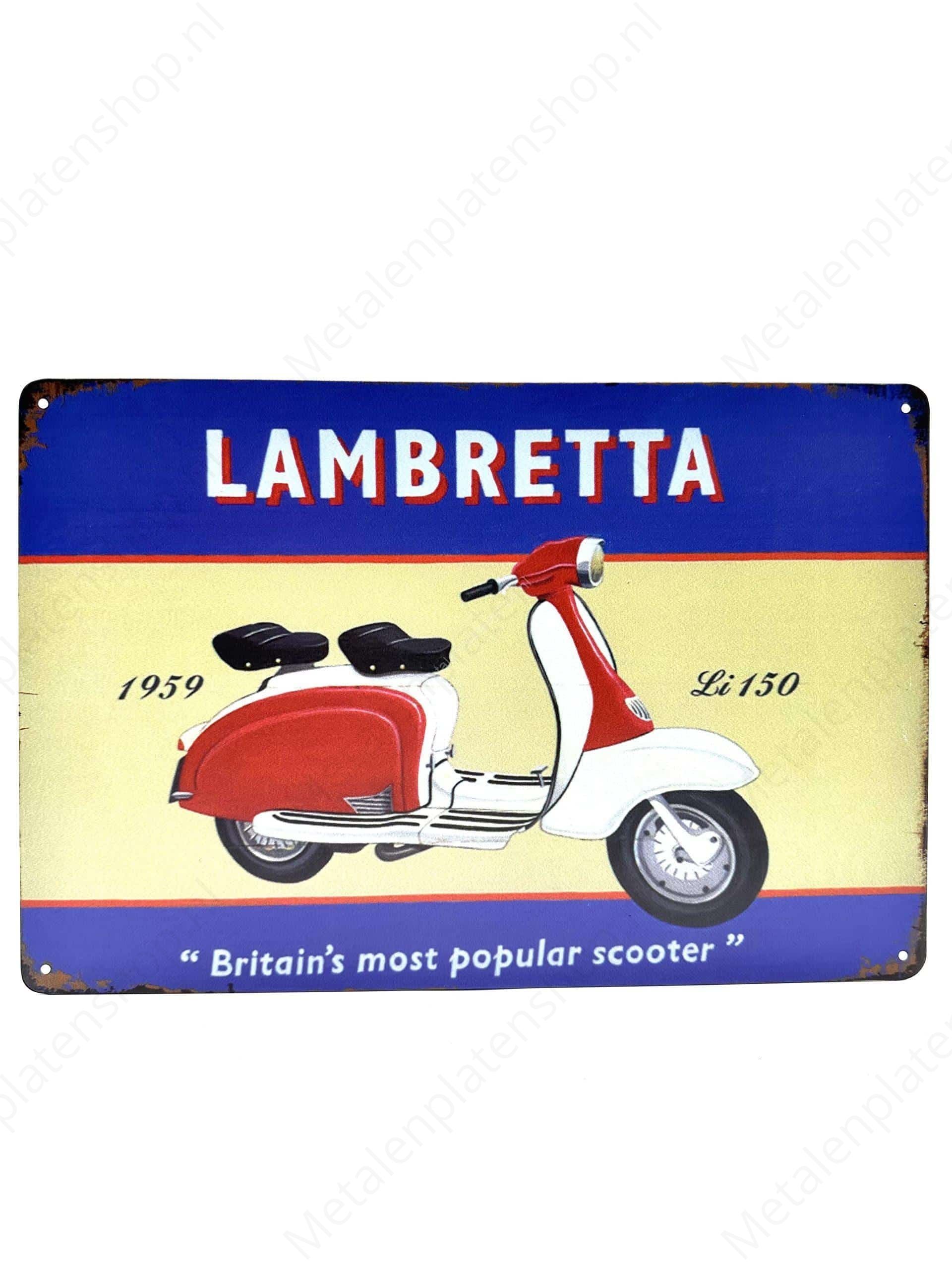 The image of the beautifully restored Lambretta Li 150 in vibrant colors immediately catches the eye. The glossy finish emphasizes the retro look, while the "Lambretta" brand name and model year "1959" give the sign an authentic character.